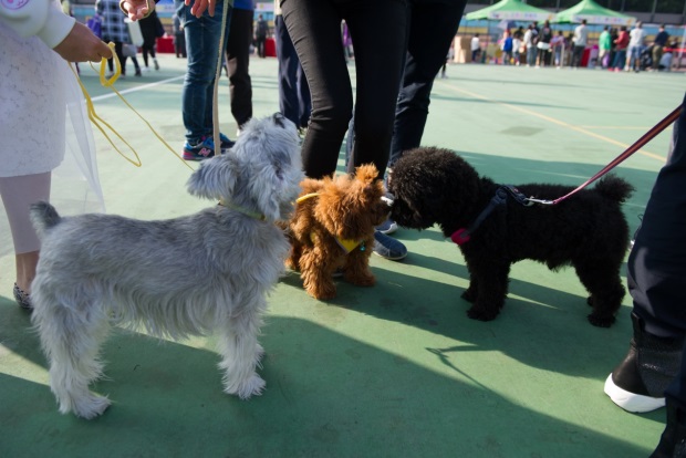 ![]() 宠物狗狗在主人的牵引下认识新朋友,正是训练社交的 好机会 . |