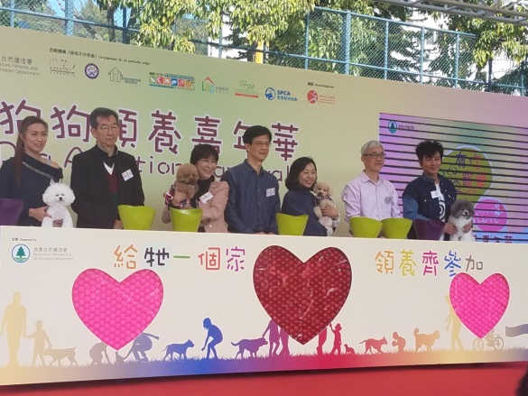 「有你宠爱」狗狗领养嘉年华启动礼(左起:宠物领养宣传大使姚嘉妮小姐、深水埗区议会主席张永森先生, BBS, MH, JP、立法局议员蒋丽芸议员JP、本署副署长苏炳民博士, JP、立法会议员麦美娟议员,BBS, JP、本署检验及检疫分署署理首席兽医师何展豪兽医及宠物领养宣传大使孙耀威先生)