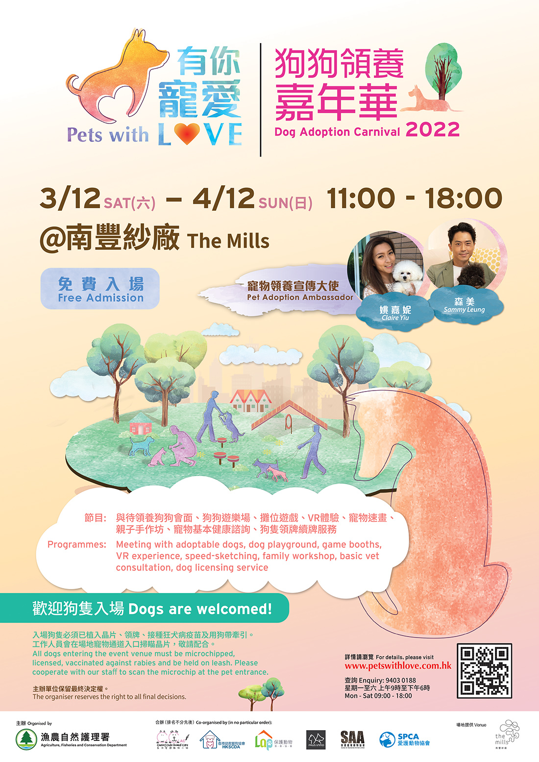 市民可在嘉年华上接触待领养的狗只,亦可申领或续领狗只牌照。嘉年华亦设有狗狗游乐场、摊位游戏、亲子手作坊、速划服务、宠物基本健康谘询服务及教育展览等。欢迎市民携同狗只参加,惟进场狗只必须领有有效狗只牌照(即场申领狗只牌照的狗只除外)、已接种预防狂犬病疫苗及植入晶片,并须受到妥善管束。